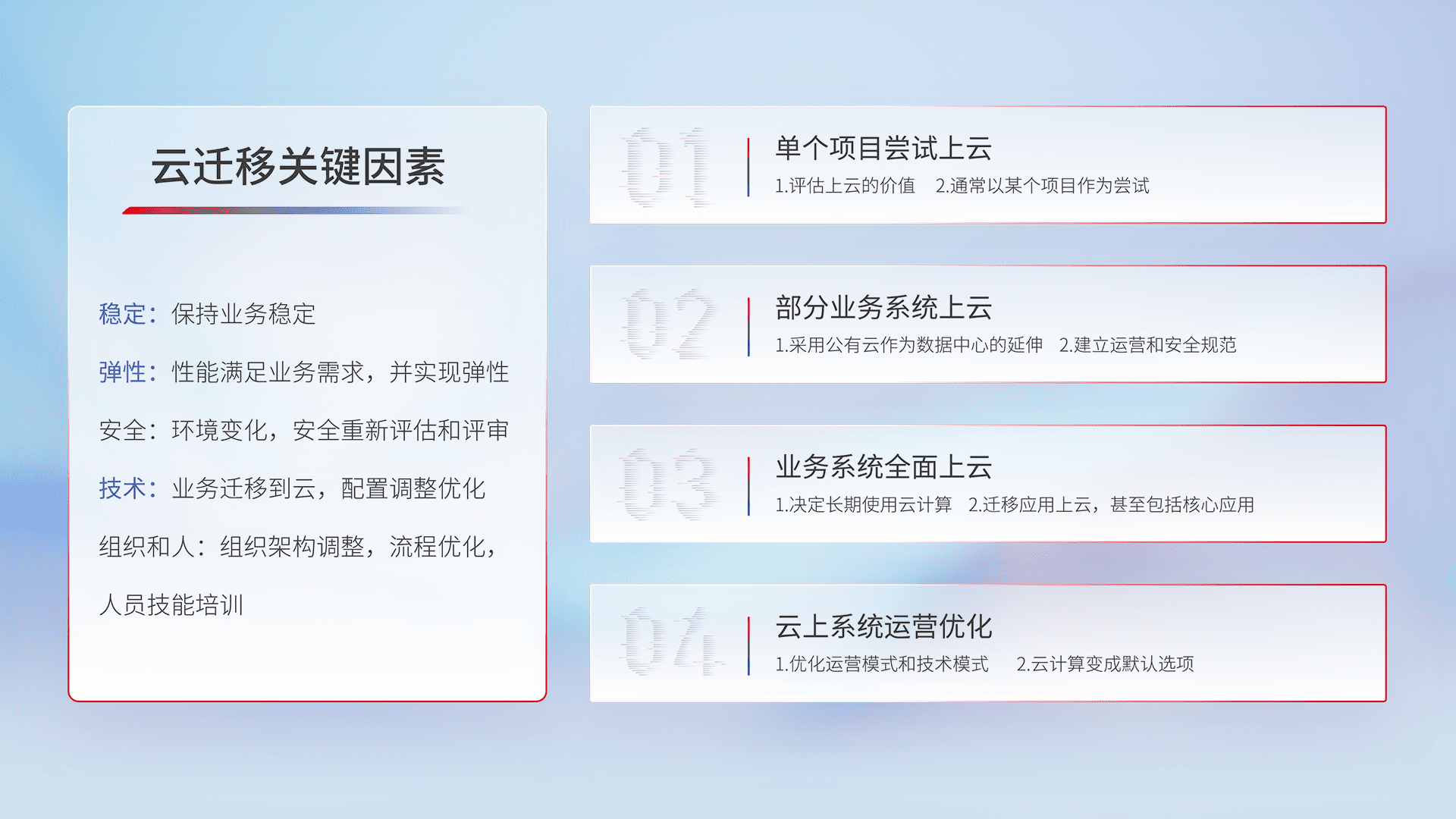 结合实际业务,,从规划设计、、云平台选型、、云原生改造、、数据迁移、、、、集成交付,,,迁移全过程为客户识别最佳上云路径,,,,做好风险识别管理,,设计网络架构、、身份权限、、、、安全审计合规、、、操作审计、、、、日志审计、、监控告警策略、、、多站点容灾设计等,,对云上基础设施进行整体规划,,,提升IT治理水平,,以满足弹性、、、、高可用、、、高性能的需求。。。。