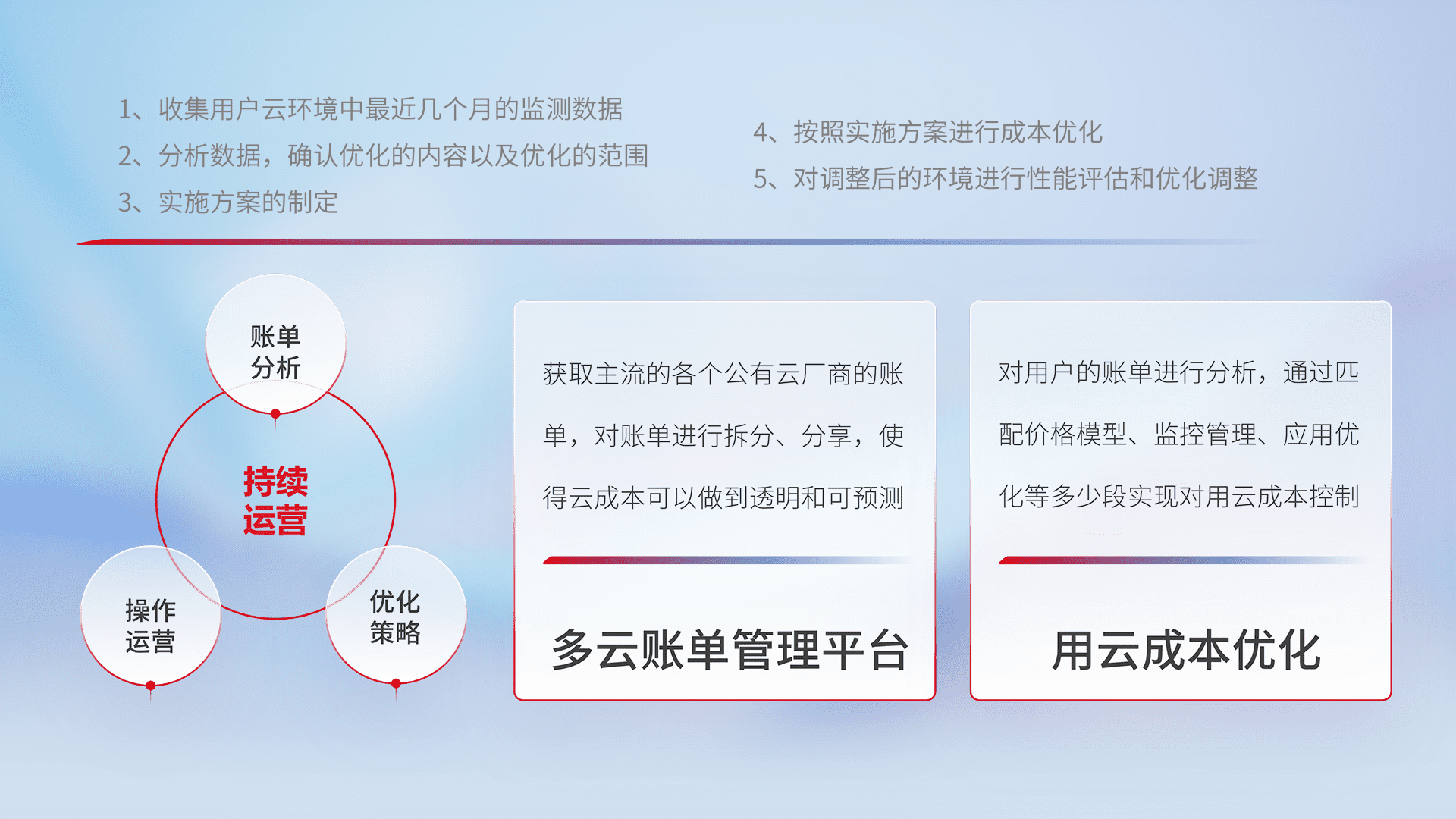 通过多云纳管,,,,以统一的资源数据模型把客户的云资源进行抽象和封装,,进而实现对多云资源的统一操作,,保障云资源管理的可靠性、、稳定性与可用性。。。。量身定制化运维内容,,配置、、、开发运维、、、补丁管理、、备份、、、监控、、认证和访问管理、、、审计和日常巡检等,,,保障在用云过程中的可靠度,,,,稳定度以及高可用率。。